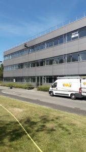 Nos techniciens peuvent intervenir pour des interventions de nettoyage en accès difficiles, comme ci dessous pour un lavage à haute pression de la façade, ainsi qu’un lavage de vitres en hauteur.